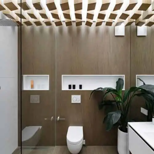 اگر سنگ سرویس بهداشتی شما هم تیره است، میتوانید کناف سقف را ساده با لاین نوری طراحی کنید تا زیبایی محیط را بیشتر کند و نور کافی به سرویس بهداشتی بدهد. اما اگر سرویس بهداشتی روشن با سنگهای رنگ روشن دارید، میتوانید از طلقهای طرح دار با رنگ شاد برای اجرای سقف کاذب سرویس بهداشتی استفاده کنید. معمولا مرسوم است برای دکوراسیون استخرها از رنگ آبی استفاده میکنند.