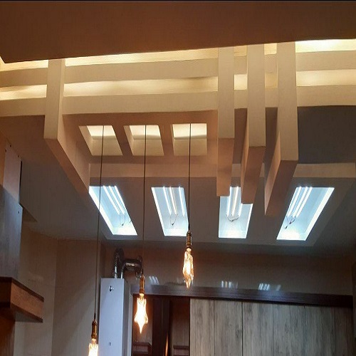 – سقف کاذب: سقف کاذب شامل پانل های شکل دار است. که با هم ارتباط دارند و یک طرح نهایی را تشکیل می دهند. این پانل ها معمولاً با طرح های هندسی، مثلثی یا مستطیلی طراحی می شوند. و به صورت متناوب با استفاده از یک سیستم آهنربایی نصب می شوند.